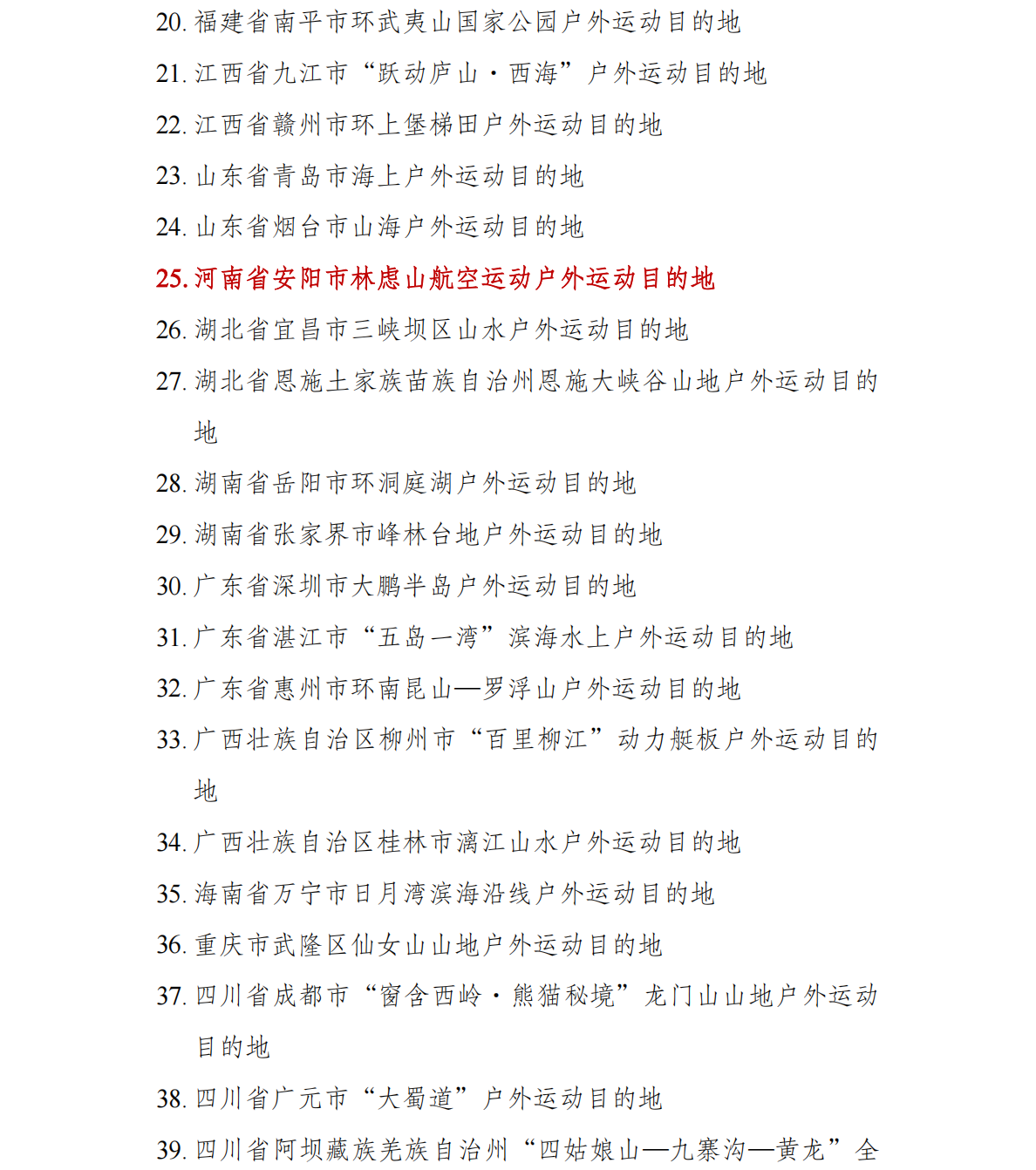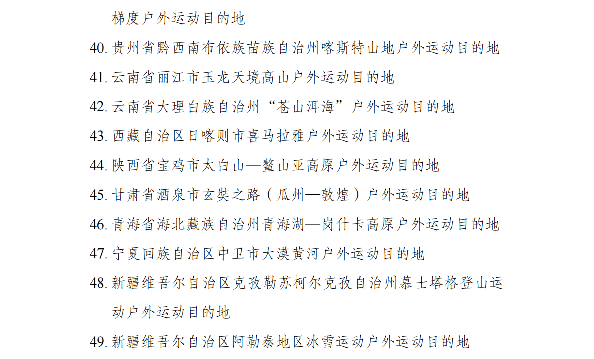 户外运动目的地建设地区名单